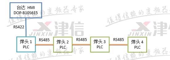 HMI和焊頭1的PLC之間采用三菱支持的RS422通訊,通訊速率可達115200bps。焊頭1的PLC和其它三個焊頭的PLC之間采用三菱PLC支持的N:N網絡,通訊速率最高為19200bps。